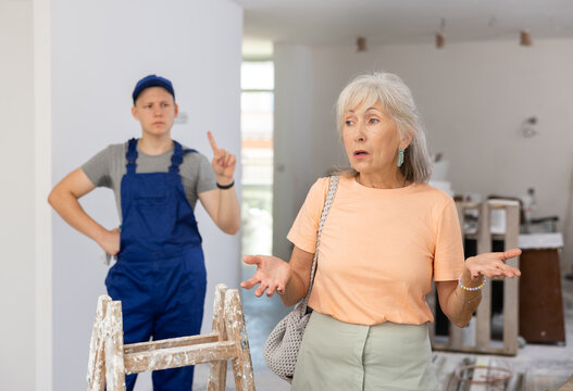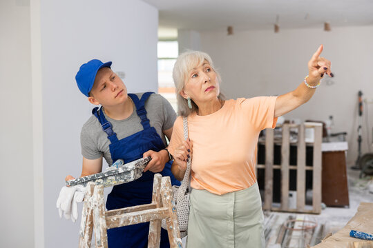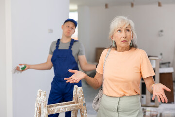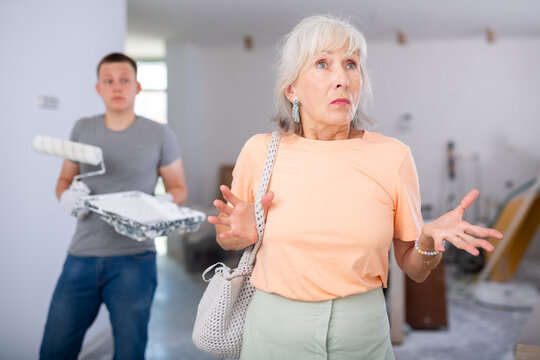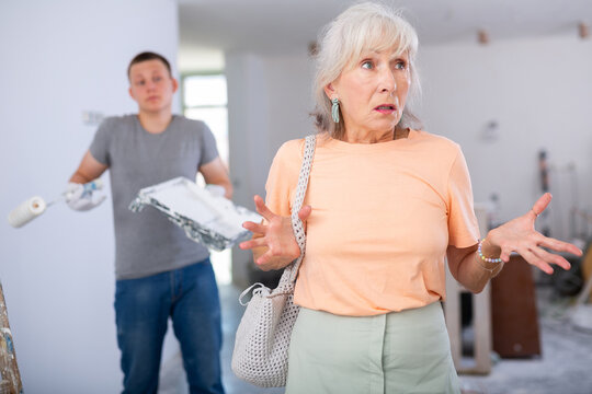 Teenage boy repair worker and disgruntled mature woman homeowner discussing process of house renovation. Grandson helping grandmother with home improvement
