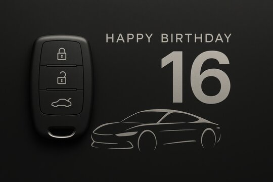 Happy birthday card for 16 years boy featuring black background, car key fob with "Happy Birthday" text, line drawing of car, number 16. Concept of happy birthday card celebrating 16th birthday.