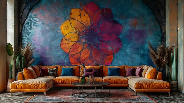 Holi festival color explosion typography on abstract block pattern with paint splatter