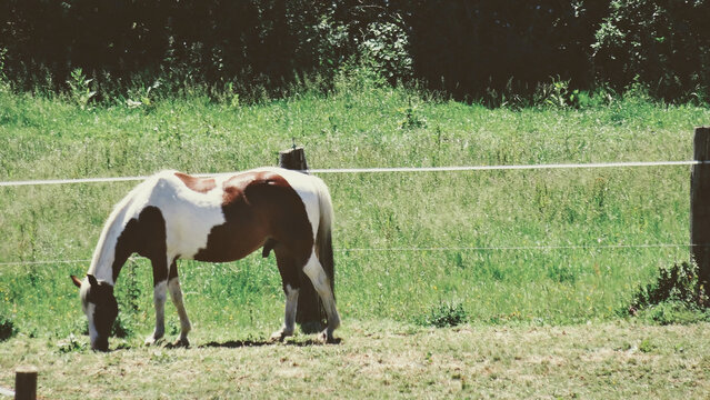 A dual colors horse who IS grazing the lawn in front of his enclosure. Vintage photography 2020-05 shooted in a 16x9 format photography