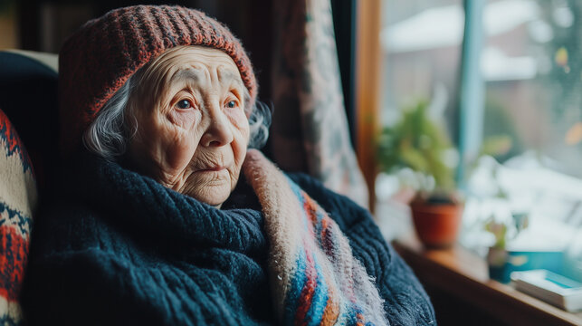 A pale, frail and elderly Asian person is unhappy and cold, dressed in warm clothes to combat freezing temperatures. Landscape format 16:9 with copy space.