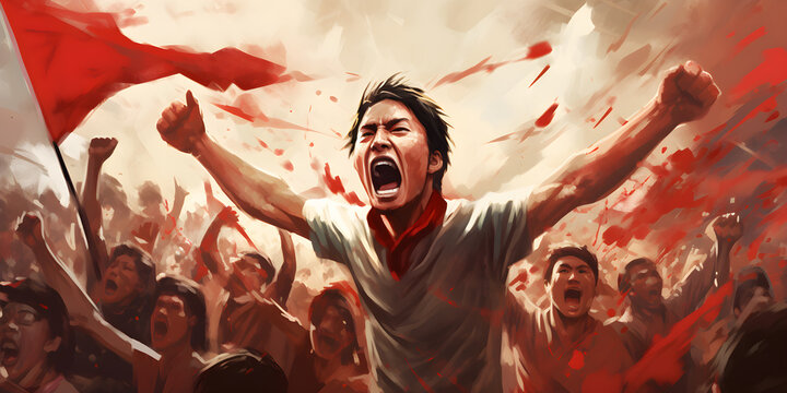Excited Asian youth celebrate Indonesia's independence day on August 17 by waving the flag