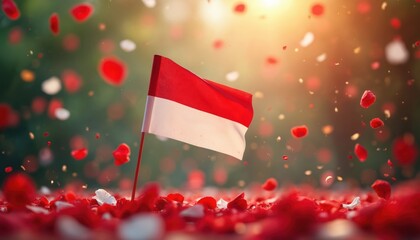 Indonesian flag on pole with red, white colors waving in air. Confetti, rose petals fall around. Background blurred with green, yellow lights. Flag represents Indonesia independence day celebration