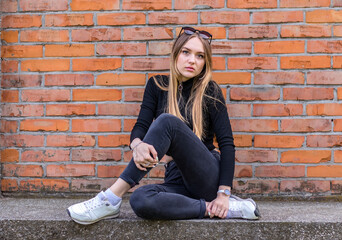 Teenage boy student 17 years old with a backpack sits on the wooden steps outside the college