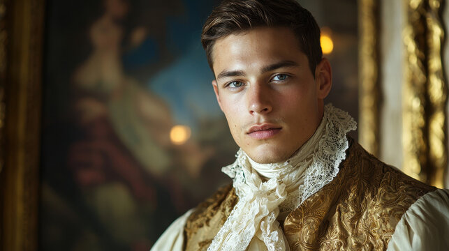 Nobleman in luxurious gold-brocaded apparel showcasing Rococo elegance from the 1700s
