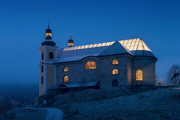 Baroque church of the Assumption of the Virgin Mary in Neratov built between 1723 and 1733. The church has a unique roof made of glass in the shape of a cross. Christmas, first snow in winter, Czechia