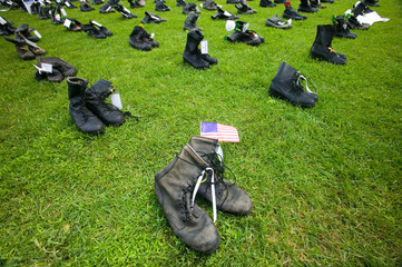 1746 Military boots symbolizing US Military Personnel killed in Iraq as displayed at Independence Hall ÒEyes Wide OpenÓ exhibit, Philadelphia, Pennsylvania on July 4, 2005