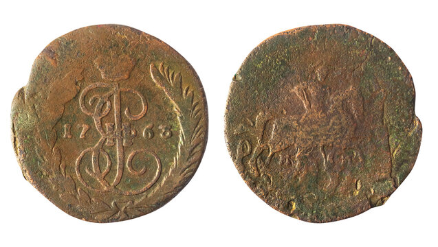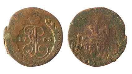 Isolated photo of 1 polushka Russian Empire 1763 Catherine 2 coin obverse and reverse on white background.