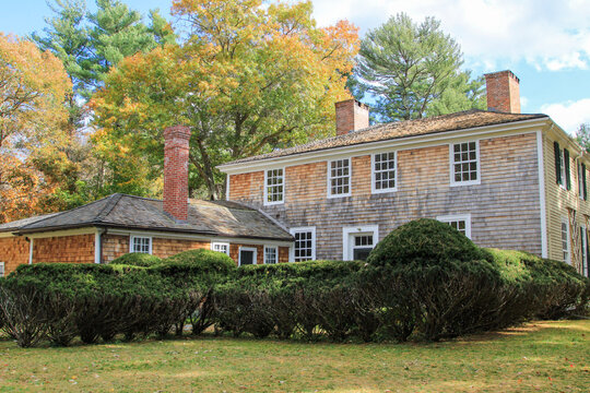 1769 Peter Oliver House: Historic Georgian Loyalist Home, Barn, and Garage in Autumn, Middleborough, Massachusetts