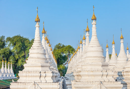 Sandamuni Pagoda stupas tops in Mandalay, Myanmar. Central pagoda surrounded by 1774 white shrines, each housing a single marble slab with the teachings of the Buddha and located near Mandalay Hill.