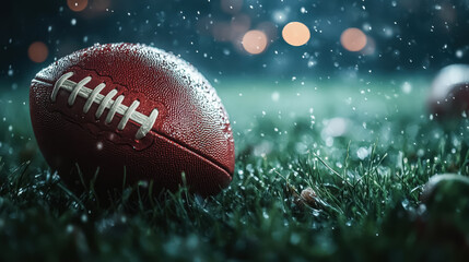 Football is laying on the grass. The grass is green and the football is brown