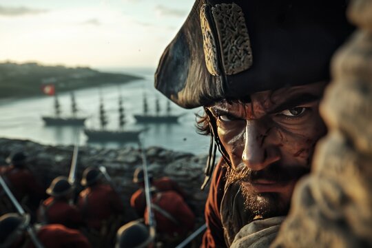 Close-Up of Intense Spanish Soldier Observing British Fleet from Fortress Wall in Cuba, 1780