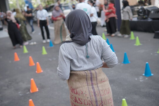 Asian woman in white shirt waving Indonesian flag excitedly in rice field