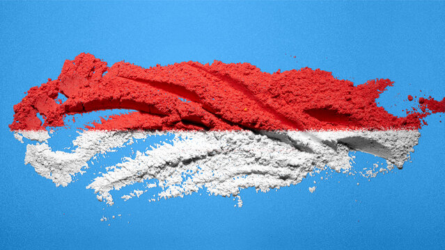 Closeup view of the red and white colors of the Indonesian national flag with a blue wall background. Celebrate Indonesia Independence Day. Concept of Kemerdekaan Indonesia