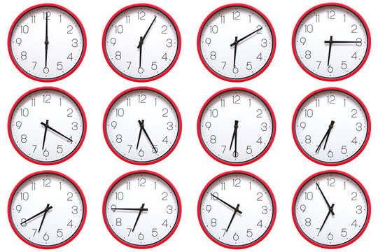 A set of 12 red wall clocks showing each hour from 06:00 to 06:55 or 18:00 to 18:55. Isolated on white background ideal for concepts related to time.