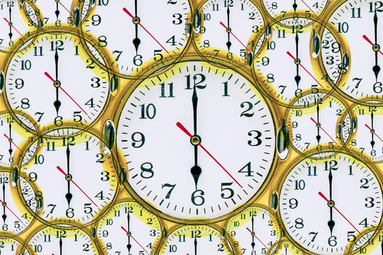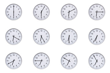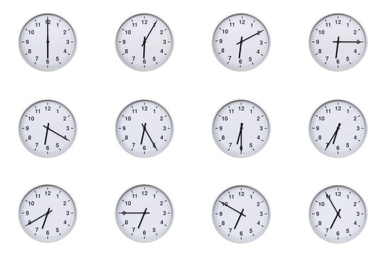 A set of 12 Minimalist Round wall clocks showing time from 06:00 to 06:55 or 18:00 to 18:55. Isolated on white background ideal for concepts related to time.