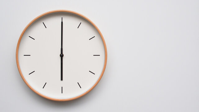 Minimalist wooden Wall Clock on White Wooden Surface with Space for Text – Time Set at 18.00/06.00