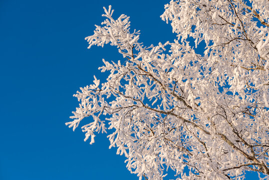 Swedish winter landscape in the countryside with birch trees when the snow has settled nicely on the trees in a very cold temperature -18 degrees.