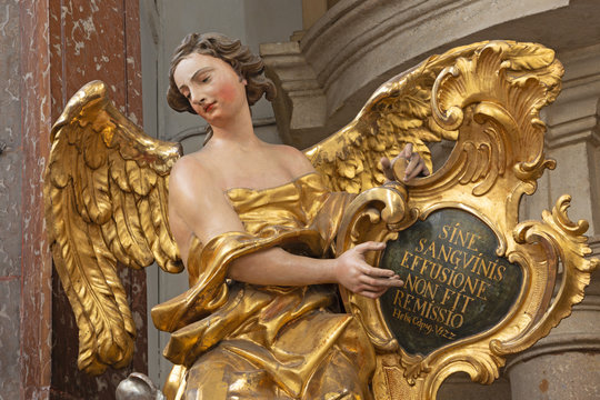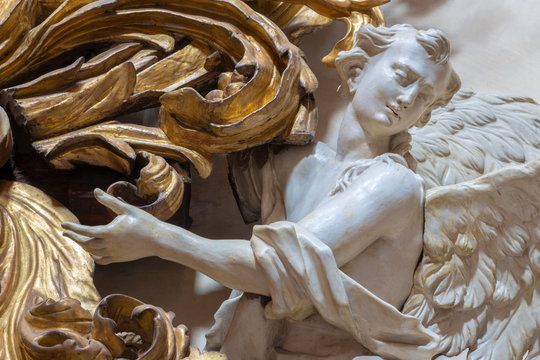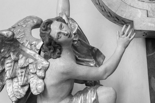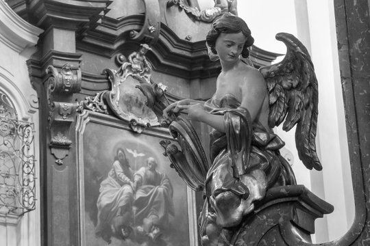 PRAGUE, CZECH REPUBLIC - OCTOBER 12, 2018: The carved polychrome baroque statue of angel from the side altar in St. Francis of Assisi church by  M. V. Jäckel a J. K. Liška. (17. - 18. cent.).