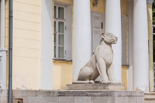 Kolomenskoye Park. The Palace Pavilion of 1825. Porch with lions. The city of Moscow, Russia.