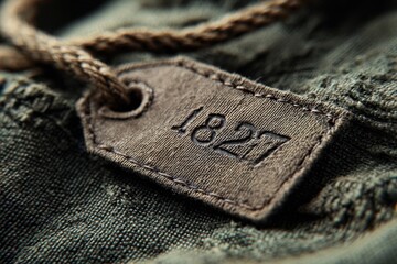 Close-Up of Fabric Tag with Stitched Number 1827 on Green Textile Background for Fashion and Textile Industry