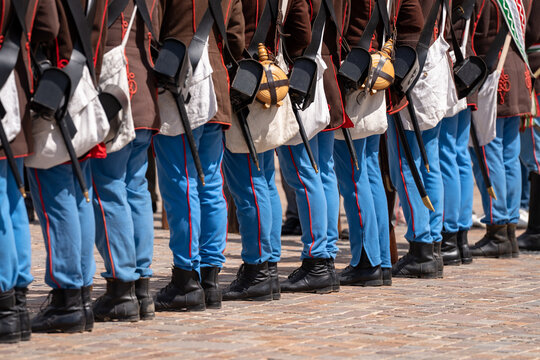 Budapest, Hungary - May 25, 2025: Ceremonial guards in Revolution-era Hungarian military dress. Hungarian hussars' boots in formation during 1848–1849 Revolution reenactment