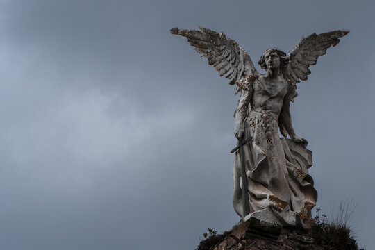 Ancient victorian statue of Destroyer Angel at a graveyard with dark sky. Statue of Abbadon from Josep Limona 1895