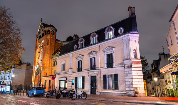 Saint Jean de Montmartre church in the 18th district of Paris, France. Historic Art Nouveau architecture features the red brick facade and tower illuminated by street lights on Rue des Abbesses