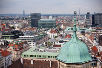 Vienna in Austria, capital city cityscape with rooftop of St. Stephen Cathedral. View on Dome of St. Peter's Church Peterskirche. 18th century Baroque style architecture