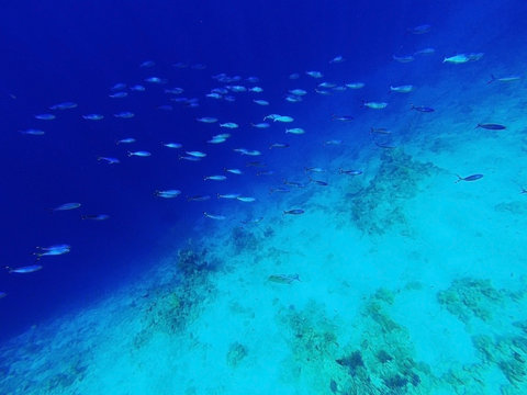Classic blue color 2020. Trendy classic blue background, blue toning 19 4052. Flock of tropical fishes in the sea underwater. Freediving and diving in sea with corals, vocation concept