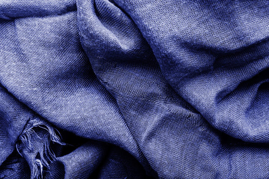 Classic blue color 2020. Texture of painted textile cloth waves. Classic blue background, blue toning 19 4052. Abstract trendy background mock up with copy space for text.