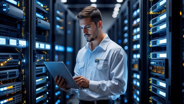 Server racks displaying data analytics overlays in modern data center