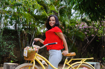 Outdoor portrait of young beautiful girl 19 to 25 years old posing in street. Brunette. riding a retro styled bicycle. Wearing red blouse With a penetrating camera look.