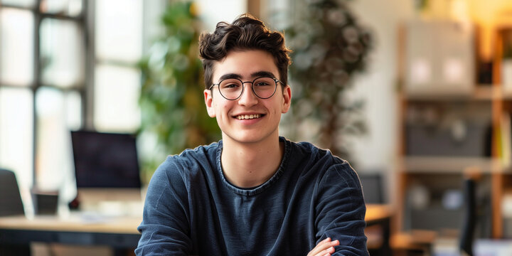 Smiling young man with glasses in a casual sweater sitting in a bright office space with plants in the background