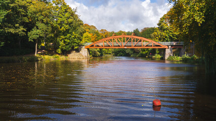 Autumn colors surrounds the red bridge Pyttebron over Ronne river which is built 1904 and still in use today in Angelholm, Sweden.