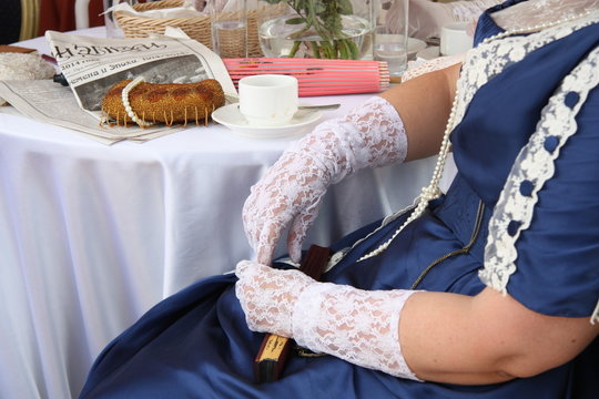 Woman in a beautiful vintage style dress with lace gloves at the table, 1910