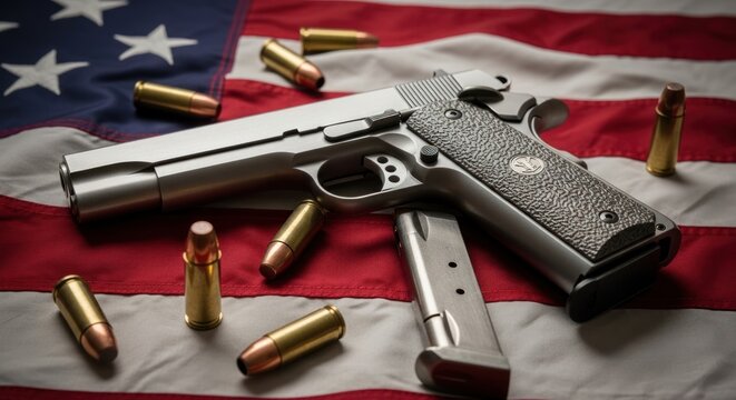 Colt 1911 pistol and ammunition arranged on American flag backdrop showcasing patriotism