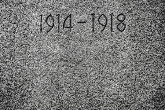 1914-1918 carved on a wall.Number 1914 on monument for the dead of the First World War. stone background texture.