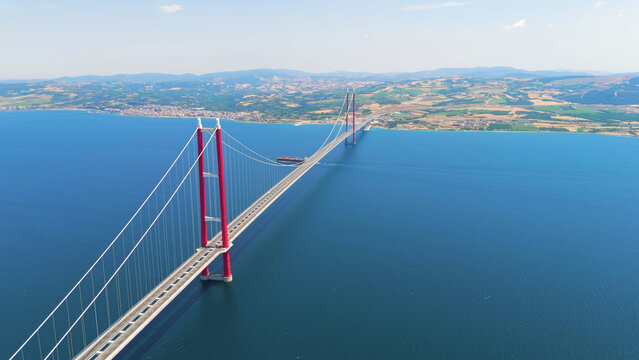 Lapseki, Turkey. Cars driving over 1915 Canakkale Bridge and a bulk carrier ship sailing under it on a sunny day. Aerial View