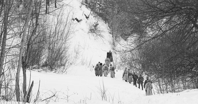 Men Dressed As White Guard Soldiers Of Imperial Russian Army In Russian Civil War s Marching Through Snowy Winter Forest. Historical Reenactment.