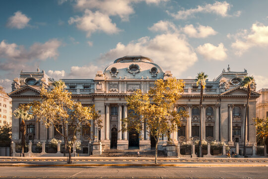 Front facade of the National Library of Chile (Biblioteca Nacional de Chile) building, downtown Santiago, Chile. It is a famous architectural landmark of Santiago that was completed in 1925.