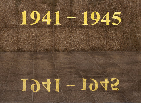 1941 and 1945 cracked numbers. Years of World War II by yellow gilded figures on a granite wall with reflection. May 9 Russian holiday Victory Day background template. Happy Victory day