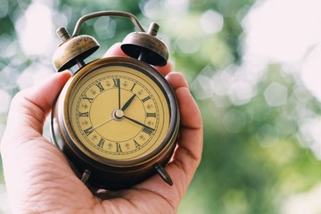 Alarm clock pointing at 1 o'clock with customizable space for ideas or text. Copy space.