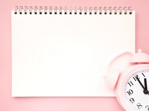 Pink background with empty blank notebook paper and alarm clock at 1 o clock