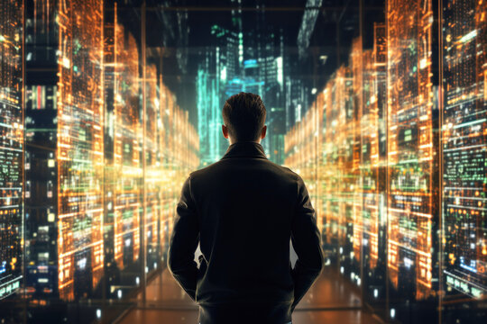 Man in front of a supercomputer in a technological institute, servers to process billions of data per second, petaflops in a data center. Data network and artificial intelligence concept. Ai generated
