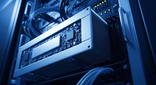 Close-up view of a data server rack with numerous network cables and hardware components.