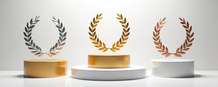 Award podium with laurel wreaths, gold silver bronze colors. Winner champion success concept, three place award. Competition achievement, best result. Sports event, 1st 2nd 3rd place.