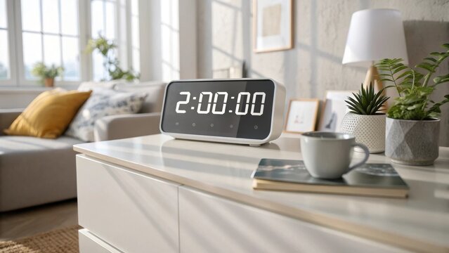 Modern digital alarm clock displaying 2 00 00 on a white dresser with plants and a couch in background