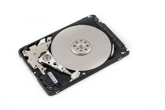 Disassembled hdd drive parts on dark background.  2.5 inch hard disk drive, hdd, top view.