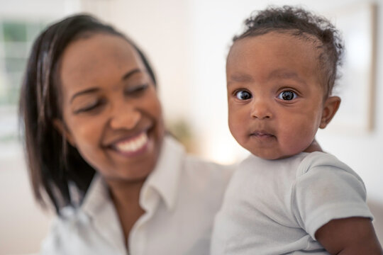 Home photo of mum holding infant child on hands. Mother hugging her little 5 months old daughter. Loving mom carying of her newborn baby. Copy space